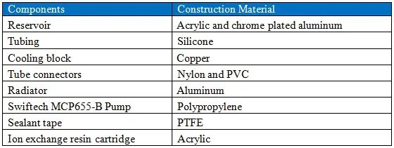 A schematic of the experimental setup is shown in Figure 2. Table 1 lists the components used for which the liquid coolant made direct contact with. Before commencing each experiment, the test setup was rinsed with UP-H2O several times to remove any contaminants. The system was loaded with 230 ml of UP-H2O and was allowed to equilibrate at room temperature for an hour before recording the initial electrical conductivity, which was 1.72µS/cm. Fluid electrical conductivity was measured to an accuracy of ±1%. After the initial measurements, the copper cooling block was placed on a hot plate operated at 80 °C. During operation the fluid reservoir temperature was maintained at 34°C. The change in fluid electrical conductivity was monitored for 136 hours. The fluid from the system was collected and stored.