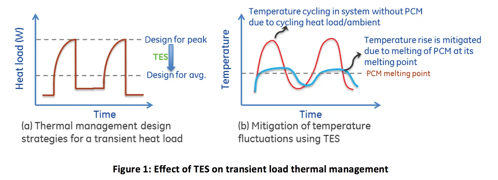 To optimize thermal designs such that they can be designed for an average heat load instead of a peak condition (Figure 1a), a thermal capacitor is needed. A key technique in the thermal domain that closely resembles an electrical capacitor is Thermal Energy Storage (TES). TES uses a phase change material (PCM), which upon absorption of heat from the system undergoes a solid-to-solid, solid-to-liquid, or liquid-to-gas phase transformation. Among these, solid-to-liquid phase change (melting of the PCM) is the most widely used TES system as it exhibits a lower volume expansion compared to a liquid-vapor phase change, and the latent heat of solid-to-solid phase change is typically lower than 100 kJ/kg [1] compared to latent heat of melting ranging between 200-300 kJ/kg for organic PCMs [2]. Phase change processes take place isothermally at their melting points, thus reducing the temperature rise of the systems that are thermally coupled to the PCM (Figure 1b).