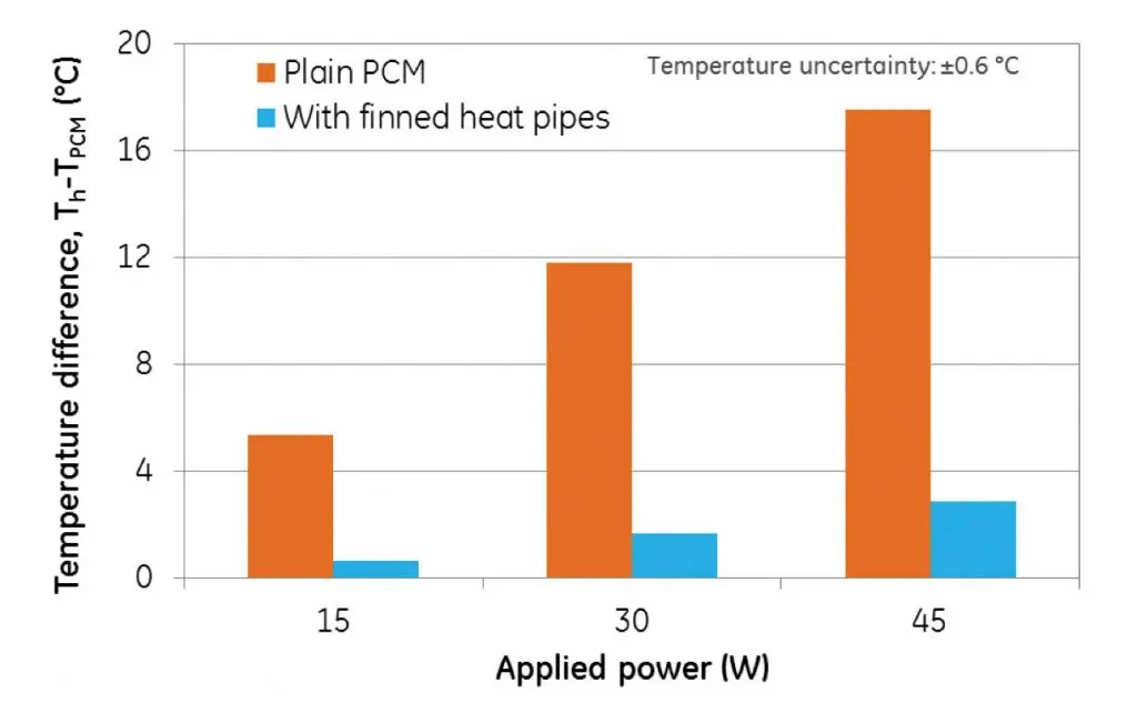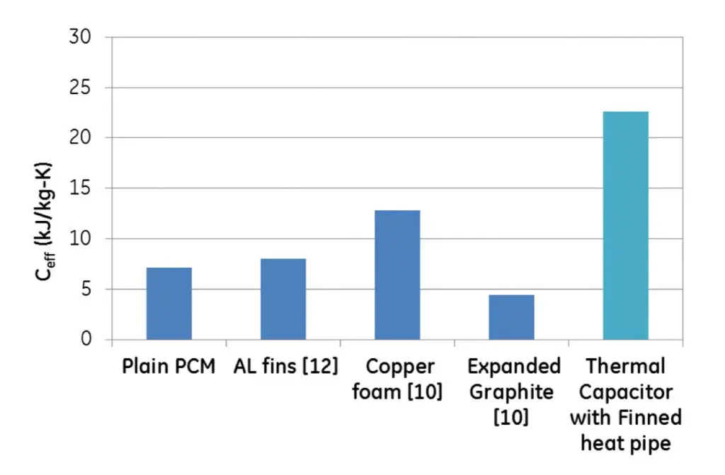 Figure 6 represents the effective specific heat of the thermal energy storage system compared against other techniques used to improve the thermal resistance of PCM. The higher capacitance of the finned heat pipe structure is directly a result of the low temperature rise of the heater over the melting point (2 °C at 30 W). It must be noted that comparison with literature was only made with systems that do not have a thin form factor in the direction of heat transfer as the role of thermal enhancement structure in thin PCM volumes are limited owing to the inherent small conduction lengths.