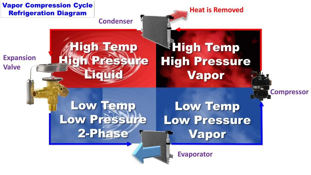 Vapor-compression cycle refrigeration is a process that uses the physics of phase change heat transfer and the unique properties of a refrigerant to transfer heat from a relatively cold source to a hot medium. Simply stated, refrigeration systems efficiently move heat from a cold source to a hot heat sink (normally air). The components in the basic refrigeration system are the compressor, condenser, expansion valve, and evaporator.