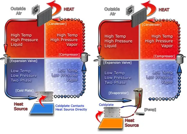 To cool liquid, the evaporator again acts as a refrigerant, this time to a liquid heat exchanger, with the pumped liquid being cooled by the evaporating refrigerant. The liquid cooled system is used for systems such as lasers, electronics, and medical devices that are designed for liquid cooling.