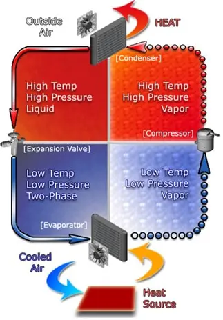 This two-phase fluid enters the evaporator where it is exposed to the heat source. The heat from the source boils off the refrigerant through phase change heat transfer, and the low temperature, low pressure gas enters the compressor, completing the cycle.