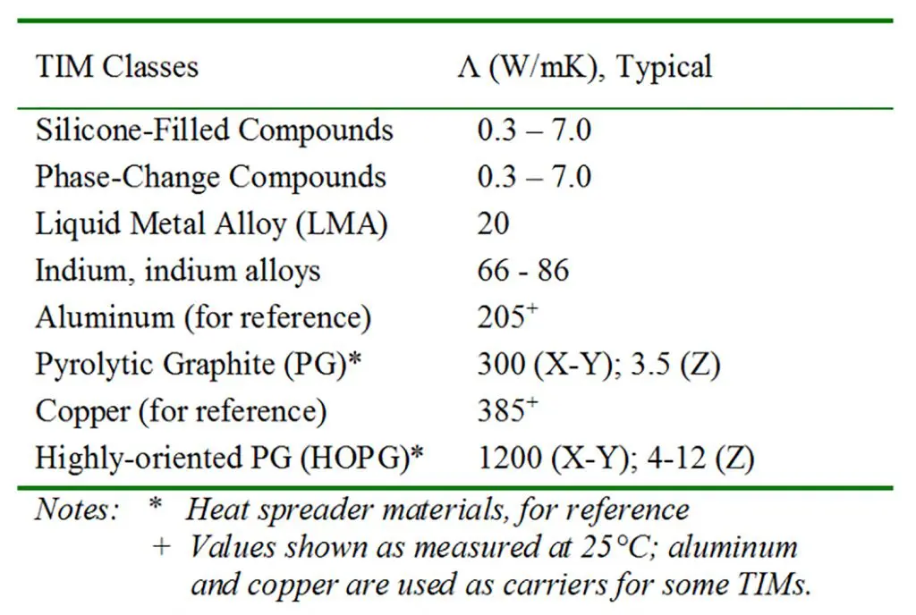 A very wide range of TIM relative bulk thermal conductivities can be found; Table 3 shows values for common as well as more recently developed materials. Note that certain materials shown have properties that are important differentiators between conventional TIM and heat spreader materials, a different material category with different requirements.