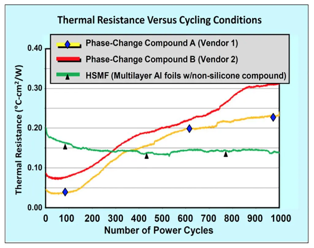 Reliability testing of these expanded metallic TIMs has included power cycling to compare their performance to conventional TIMs, as shown in Figure 2.