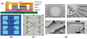Figure 3. (a) Packaged thermal test vehicle. (b) Representative power map. (c) Relative thermal sensor locations. (d) SEM image of orifices and radial expanding channels.