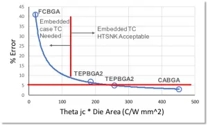 The error in Thetajc measurements made with a thermocouple inserted in the heat sink is plotted in Figure 6 as a function of Thetajc * ADie. At large Thetajc * ADie, the error is less that the 5% target, see for example the CABGA package. However, when Thetajc * ADie is smaller than 125 C/W*mm2, the error becomes quite large. The FCBGA package will require thermocouples mounted into the case.