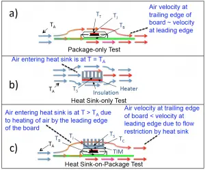 Figure 5 provides diagrams representing conjugate heat exchange with the flowing air for three test conditions involving either a) the package attached to a board or b) the heat sink with an attached heater, or c) the heat sink mounted to the package/board assembly. It indicates that in case (c), both the package/board and the heat sink are not cooled as efficiently by the airflow as when they were tested separately. This is due to a combination of preheating of the air the flowing into heat sink and to the reduction of the air velocity in the downstream half of the board.