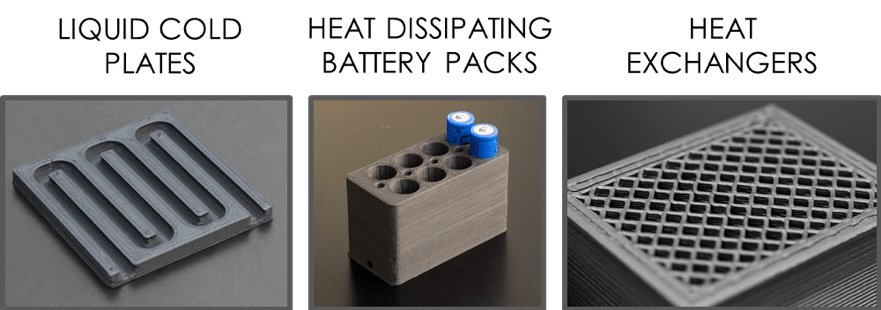 This demonstration shows the thermal performance in a very simple application; however, the technology is currently being implemented to print much more complex electronics cooling and heat transfer technologies. As illustrated below, TCPoly materials can be used to 3D print corrosion resistant and lightweight liquid cold plates, custom battery packs with internal cooling channels for battery thermal management, and high-performance heat exchangers that are lightweight as well as fouling and corrosion resistant.