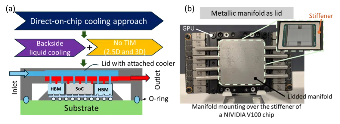 In recent years, high-power AI chips are usually packaged in a lid-less configuration, which greatly complicates thermal management and requires new and innovative cooling concepts to dissipate heat generated during operation. Also, these chips include a stiffener ring around the perimeter of the package to provide mechanical stability, maintain package flatness, and serve as a platform for the cooling solutions.