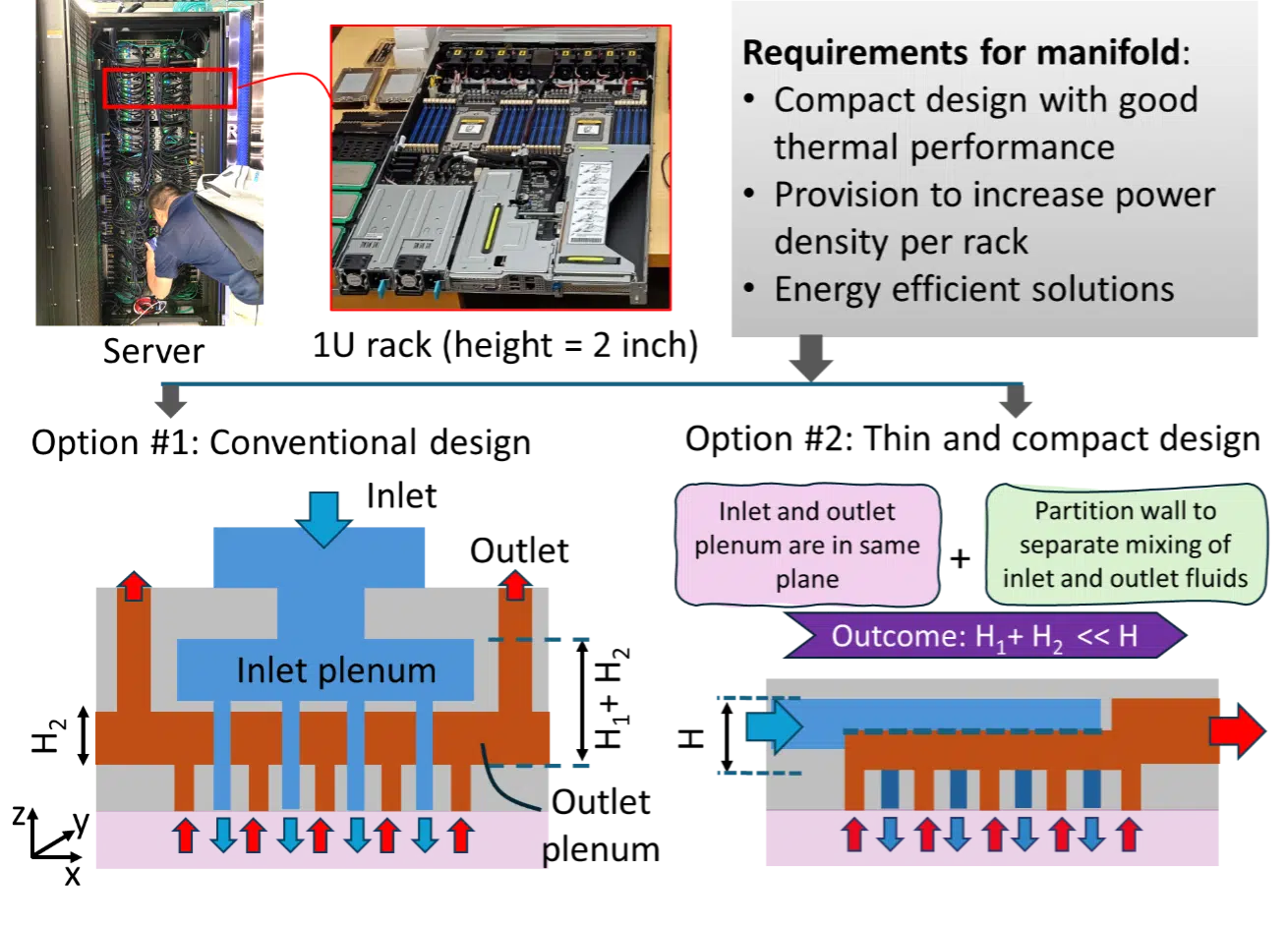 Since increasing computing per unit volume necessitates reducing the physical size of the hardware, a 1U server with only 2 inches (50.8 mm) of vertical height offers the lowest common form factor, allowing for higher compute density within the rack. This imposes a strict space constraint on the thermal management solutions to reduce overall dimension, especially in the z-direction.