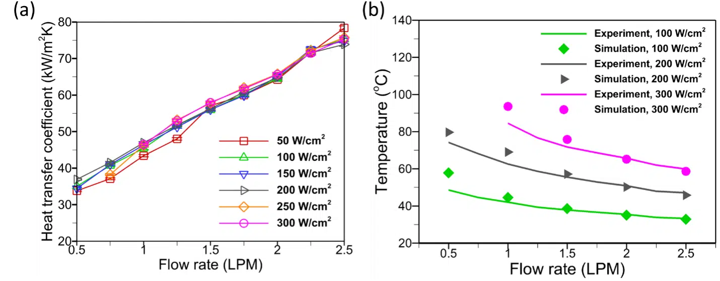 In the high-power AI chips applications, heat flux at the maximum thermal design power (TDP) may reach up to ~200 W/cm2. The heat transfer coefficient (HTC), which is a measure of heat dissipation performance, is plotted for various experimental conditions of flow rate and heat flux, with water as the working fluid, see equation 1.