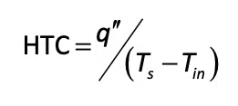 Where, q”, Ts, Tin is heat flux, surface temperature and inlet fluid temperature, respectively. The HTC is calculated to be 80 kW/m2K at a flow rate of 2.5 LPM, which translates to a very low thermal resistance of ~0.1 K-cm2/W, see Figure 4(a).
