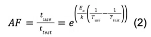 Even within the subset of failure modes that do follow an Arrhenius relationship, the activation energy for these failures is not constant [8]. Along with this wide range of activation energies, most also have more than one accelerating factor. As such, predicting an improvement in system lifetimes based on arbitrarily lowering temperature rarely results tangible gains. The most practical use of this Arrhenius relationship is in the design of accelerated lifetime tests to determine mean time to failure (MTTF) for new designs undergoing reliability qualification and testing. The JEDEC standard JESD88E formalizes the calculation of an acceleration factor (AF), which is used to estimate how long it takes for a failure to occur in a high-stress test environment compared to the time it would take under normal field conditions at a lower temperature [9]: