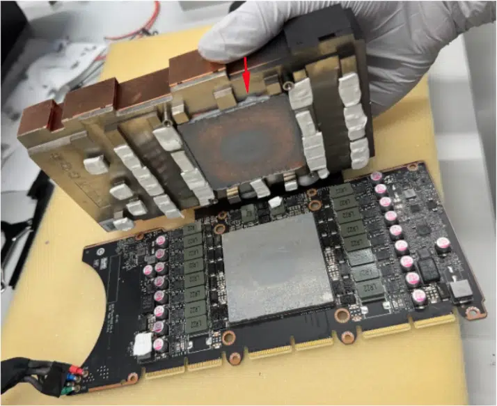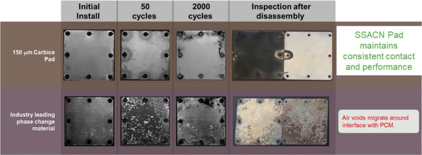 To demonstrate this characteristic, an accelerated life test was conducted where a 150 μm SSACN thermal pad from Carbice and an industry leading PCM were bolted between two plates with dissimilar CTE (Al and Invar). A description of the test setup and methodology can be found at [12]. The bolted joint was cycled 2000 times from -55°C to 110°C, with periodic in situ inspection of the interface coverage through acoustic microscopy. While both specimens had uniform coverage at the beginning of the test, the PCM rapidly developed voids that migrated around the interface throughout the duration of the test. These voids map to areas of localized loss of contact in the interface where hotspots and failures may occur in functional systems. The SSACN, on the other hand, maintained consistent coverage throughout the test (Figure 1a). Similar PCM nonuniformity can be found on contemporary GPUs (Figure 1b).