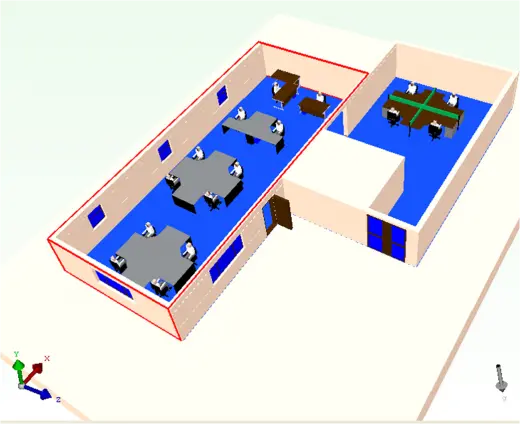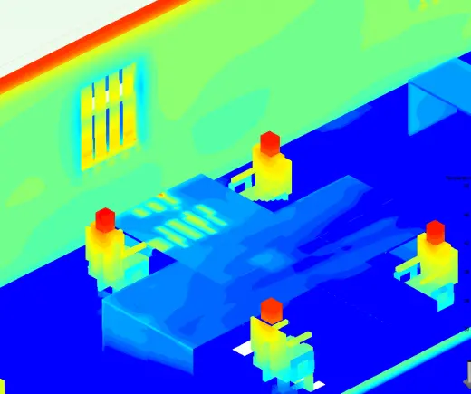 The solar loading model in FloVENT was able to simulate the heating up of the tables near the windows, including the blanking effects of the blinds.