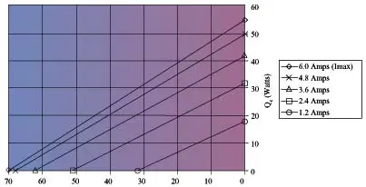 These values are based on the estimate Th = 35°C. Once thepower into the thermoelectric is determined, Equations 1 and 2 can be used tosolve for Th and to determine whether the original estimate of Thwas appropriate.