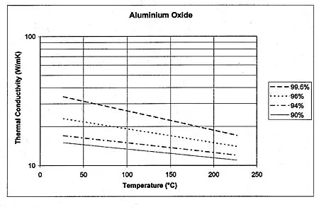 Aluminum Oxide (Al2O3) is an important ceramic for the electronics industry. Besides its use as a passivation layer on Silicon, the ceramic is often used as a carrier for thick and thin film passive components and for other small printed circuit boards. A relatively low cost is combined with a relatively high thermal conductivity, especially when compared to FR4 board material. Other ceramics such as Beryllium Oxide and Aluminum Nitride feature a much higher conductivity, but at a much higher price. Hence, the thermal conductivity of Al2O3 is of much interest to a designer. However, a word of caution should be issued. The use of values taken from some general list which often accompanies popular articles on electronics cooling is not recommended. The reason becomes clear when taking a closer look at the graph, showing the thermal conductivity as a function of temperature, with the impurity of the ceramic as a parameter. It is obvious that the values are highly sensitive to both temperature and impurity level, making the representation by one value only very doubtful.