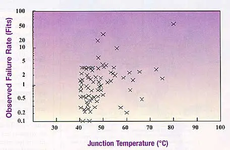 Figure 1: Scatter diagram showing the lack of correlation between observed failure rate and junction temperature of different bipolar integrated circuits [Hallberg 1994].