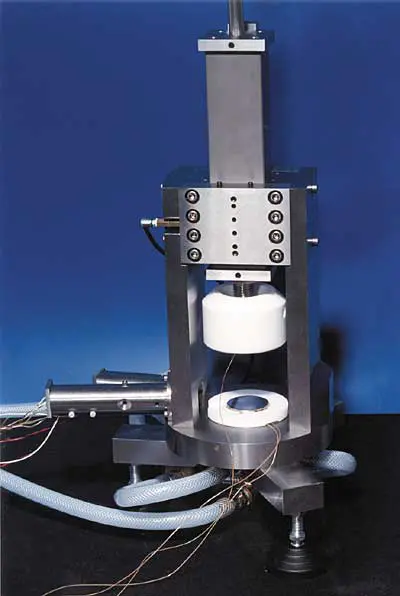 Figure 1. Picture of Interface Resistance Tester.Figure 2 shows the total thermal resistance including the contact resistances for a typical soft TIM as a function of pressure. The two curves represent two test sets: from low to high pressure and back. Observe the scale of the y-axis: It runs from 0.606 to 0.618 °C/W. The error bars represent � 0.001 °C/W.