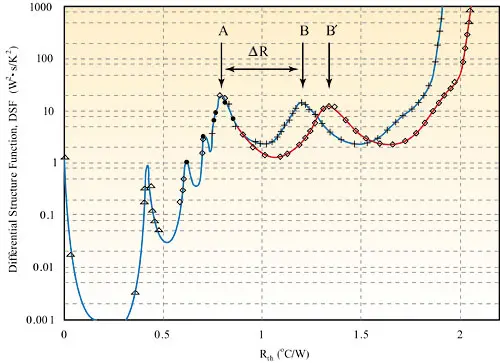 Secondary standards differ from primary standards in being much cheaper. Figure 3 shows one of the deliverables of the PROFIT project [8]. At t = 0, the heater is activated and the temperature is monitored at points A and B. A transient tester using special software transforms the response curves into so-called differential structure functions, DSF.