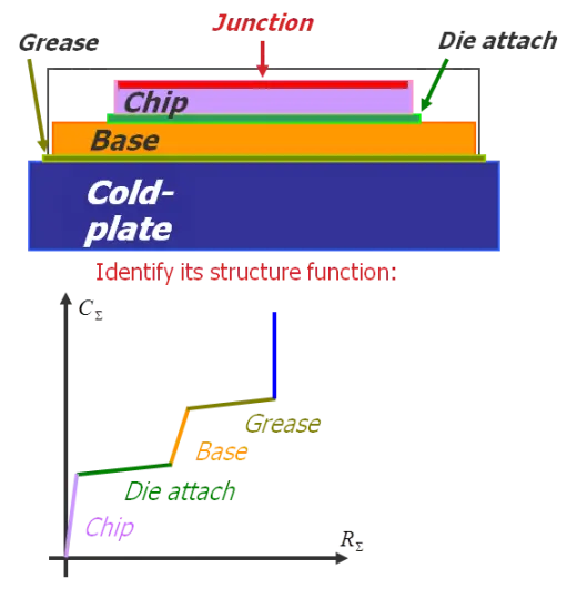 The structure function is shown graphically as a graph of thermal resistance vs. thermal capacitance the heat experiences as it travels from the junction (origin) to the surrounding ambient.