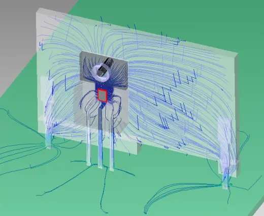 Taking 2D slices through a 3D model often doesn’t take into account the more complex heat flow paths the heat weaves through on its way from its source (die) to the ambient. Looking at lines of heat flux in a semi-transparent view of the geometry highlights an interesting heat flow feature…
